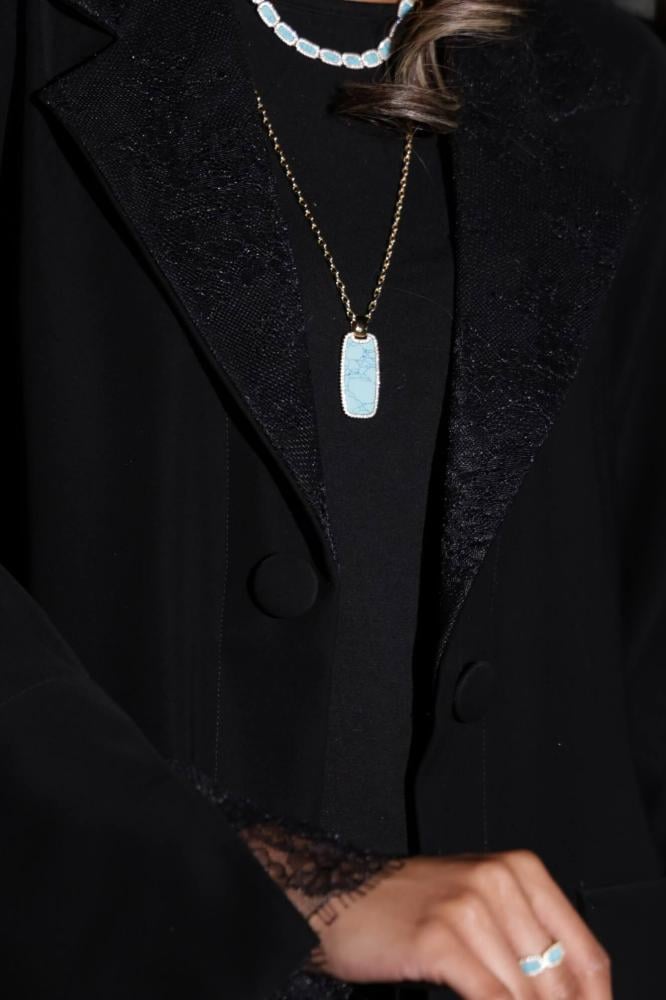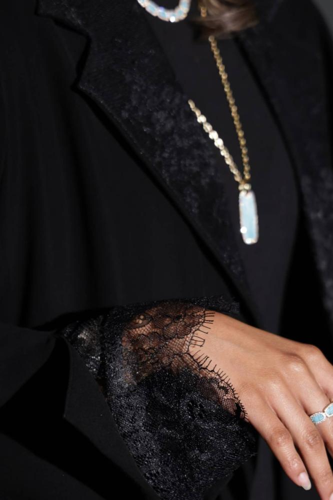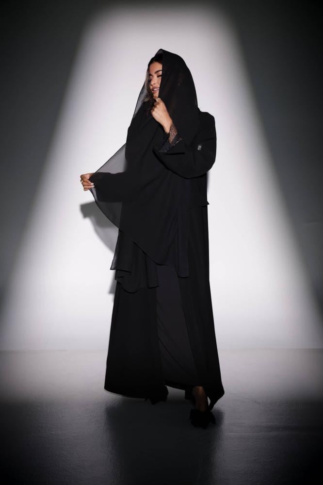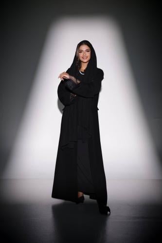 استمتعي بالفخامة مع هذه العباية الفاخرة المصنوعة من قماش كريب أسود ناعم، والتي تتميز بتطريز دانتيل فاخر على الأكمام والرقبة لإضفاء لمسة أنثوية جذابة. تم تصميمها بقصة الجاكيت العصرية التي توفر راحة وأناقة في نفس الوقت، مما يجعلها خيارًا مثاليًا للمناسبات والخروجات الراقية.